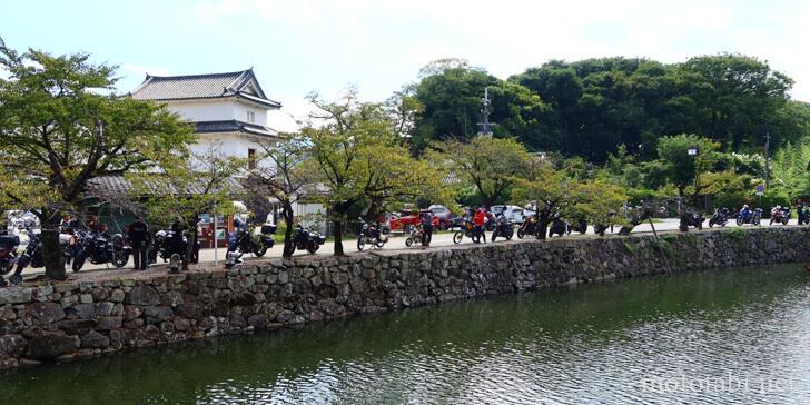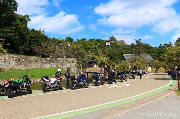 それは、私たちだけでなく、ほかの方も同じようで、彦根城の前でたくさんのバイクが停まっていました。
