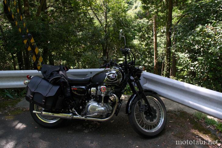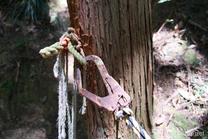 ガードレールに黄色いテープが貼ってあり、「滝入り口」と書かれています。