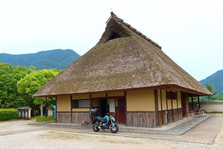 鐘がある場所の階段を上ると、茅葺民家の全体がよく見え、バイクとの写真撮影に良い感じです。