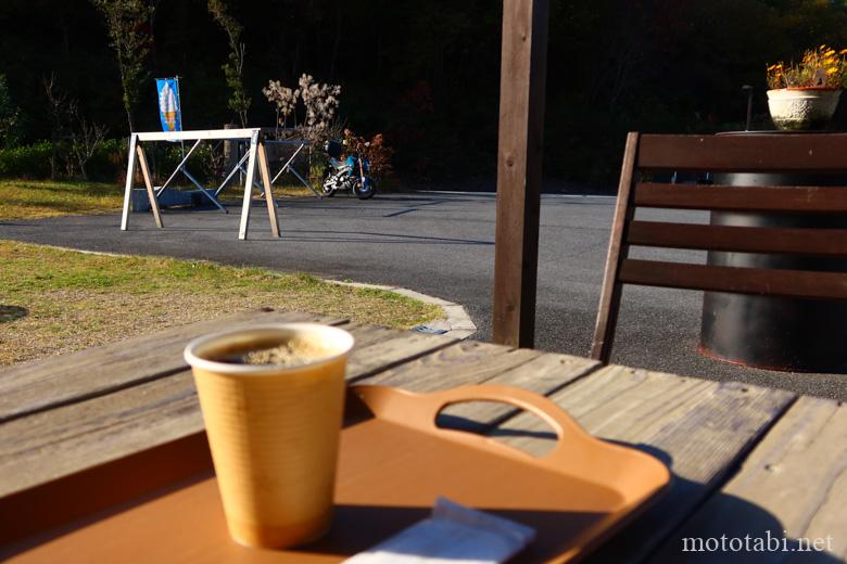 屋外のテーブルでコーヒーを飲みながら休憩しました。