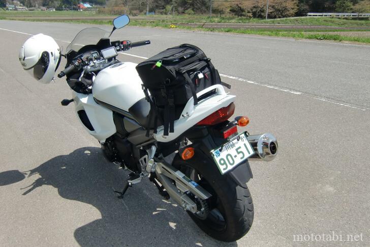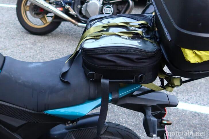 シートの下にアマゾンで購入した荷締めベルトを通し、タンクバックを固定。しかしちょっと不安定。