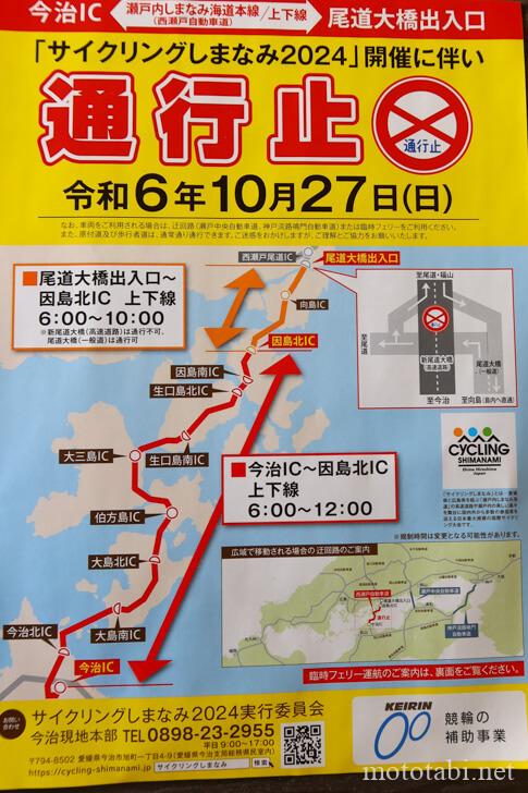 宿とフェリーの予約後に、10月27日(日)は「サイクリングしまなみ2024」開催のため、通行止めと知りました。1日予定をずらそう塔も考えていたので、これをみて焦りました。