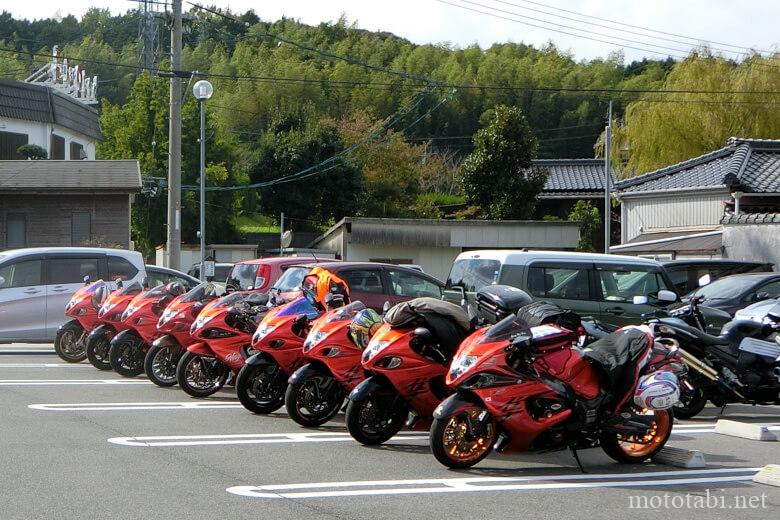 駐車場へ戻ったら、赤い隼が9台も停まっていました。