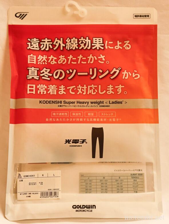 ゴールドウィンの光電子スーパーヘビーウェイトパンツ(製造終了商品)は、商品の袋に「真冬のツーリング~日常着まで対応します」と記載されています。実際に真冬に試したところ、暖かく感じました。