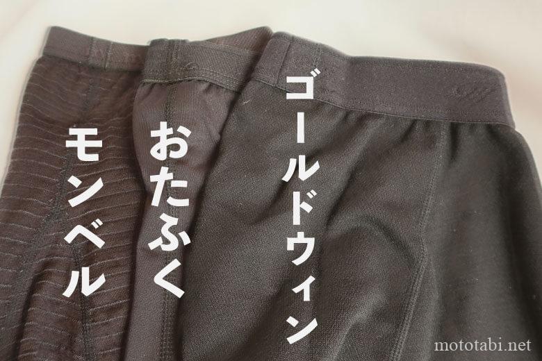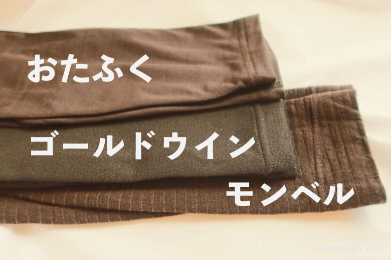 モンベルは他の2つより5cm長いです。タイツをはく前にソックスをはいているからかもしれませんが、着用したときに長さの差は感じません。